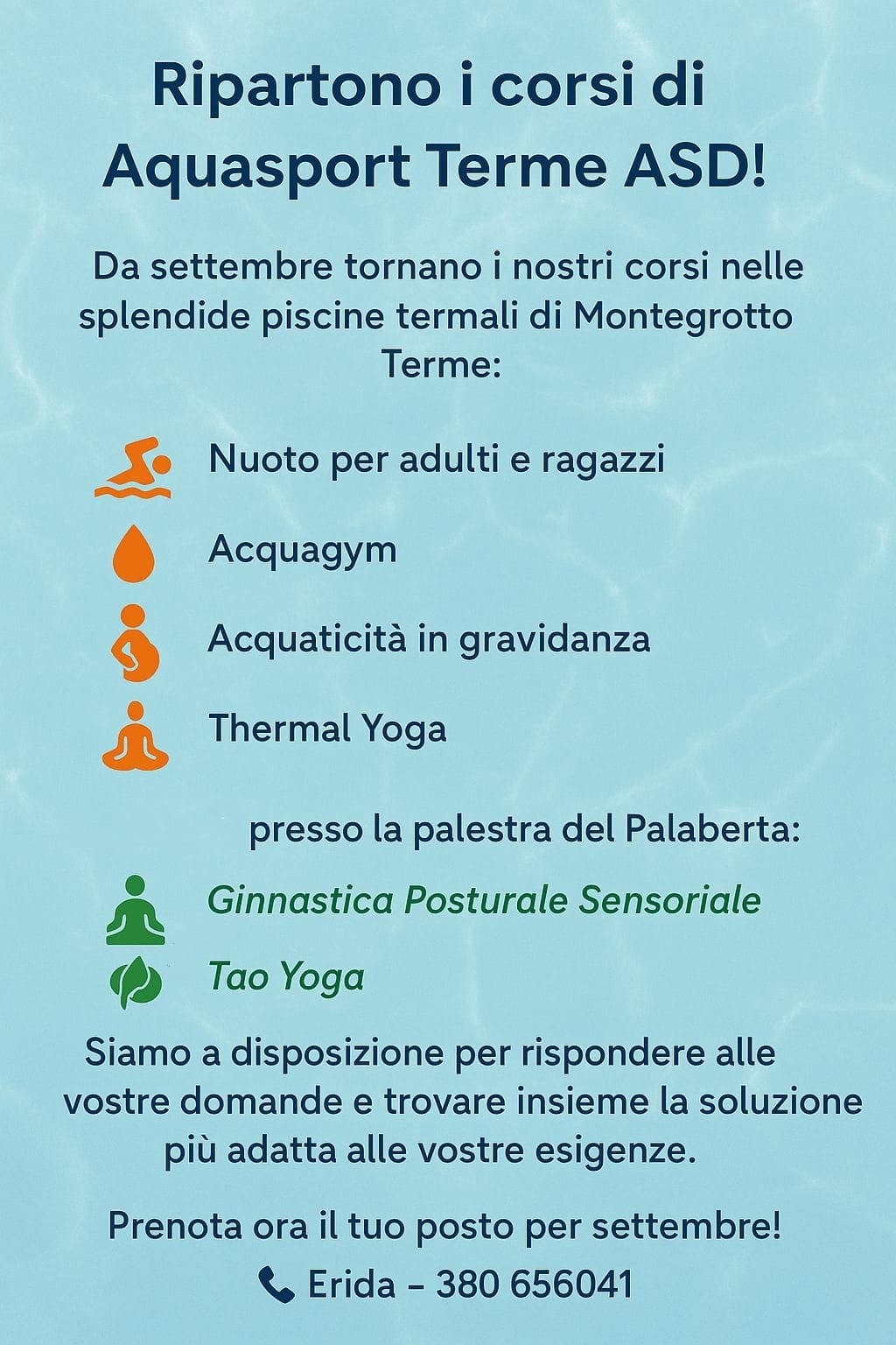 Chi siamo Siamo un’associazione sportiva dilettantistica iscritta al Registro CONI. Dal 2008, portiamo avanti il progetto di attività motoria in acqua termale, offrendo i nostri corsi nelle piscine delle zone termali di Abano e Montegrotto Terme. È proprio da questa stretta connessione con l’acqua termale che nasce il nome della nostra associazione: Aquasport Terme .